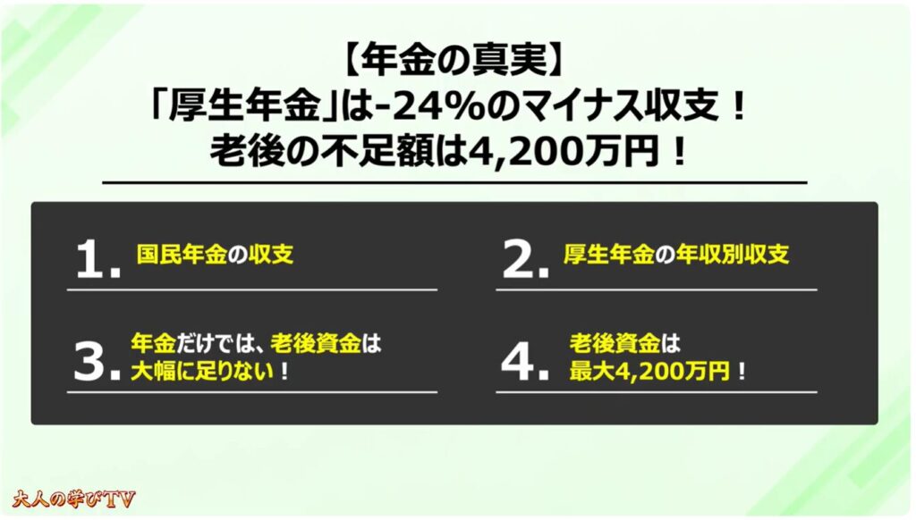 今回は、【年金の真実】「厚生年金」はマイナス収支!老後は4,200万円も必要!について一緒に確認していきましょう。