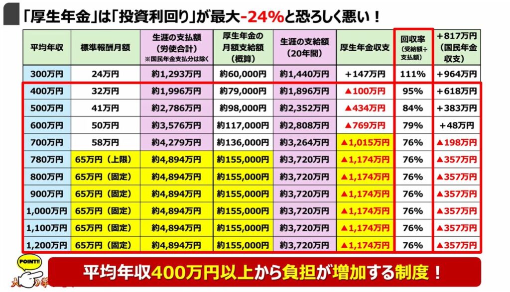 「厚生年金」は、平均年収400万円以上になると、利回りがマイナスに転じ、最大でマイナス24%になります。