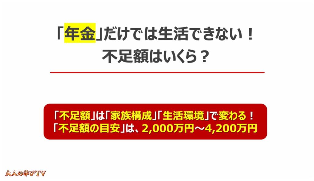 むしろ、家族構成や生活環境で変わりますが、年金以外に2,000万円~4,200万円の資金が必要になると言えます。