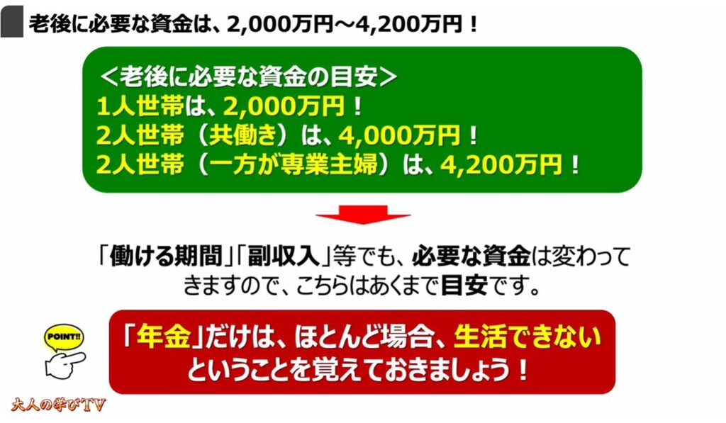 「働ける期間」「副収入」等で、必要な資金も変わってきますので、この金額はあくまで目安です。