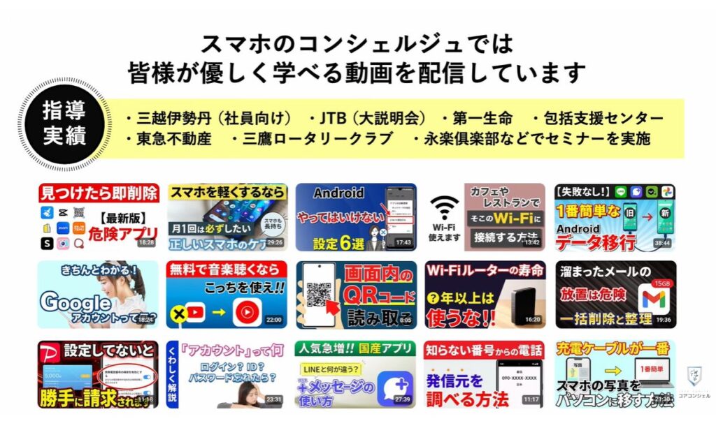 スマホのコンシェルジュでは、豊富な指導実績をもとに、スマートフォンの使い方に関する動画を配信しております。