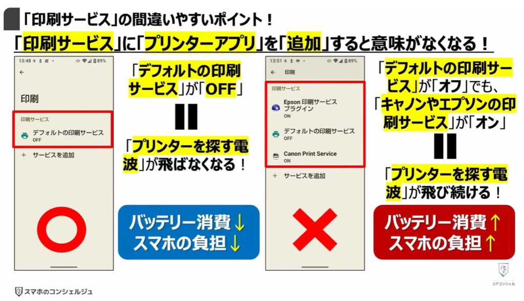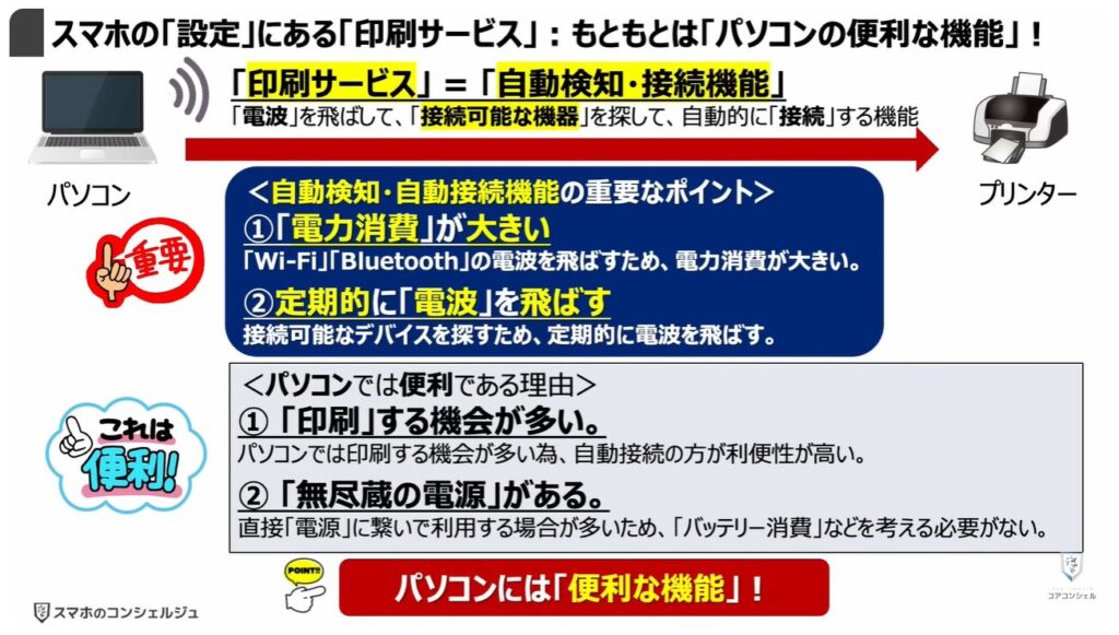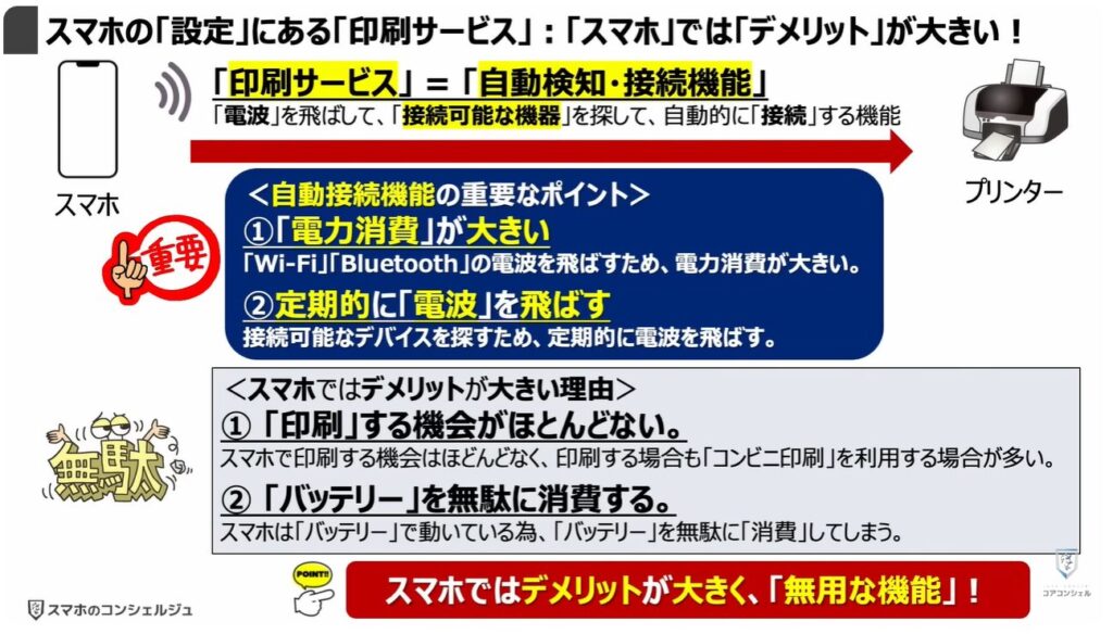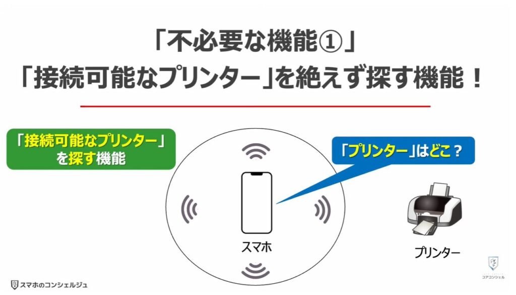 まず一つ目、スマホは印刷機能の使用状況に関わらず周囲をスキャンして「接続可能なプリンター」を絶えず探しており、これがバッテリーやスマホのリソースに少なからず影響を与えています。
