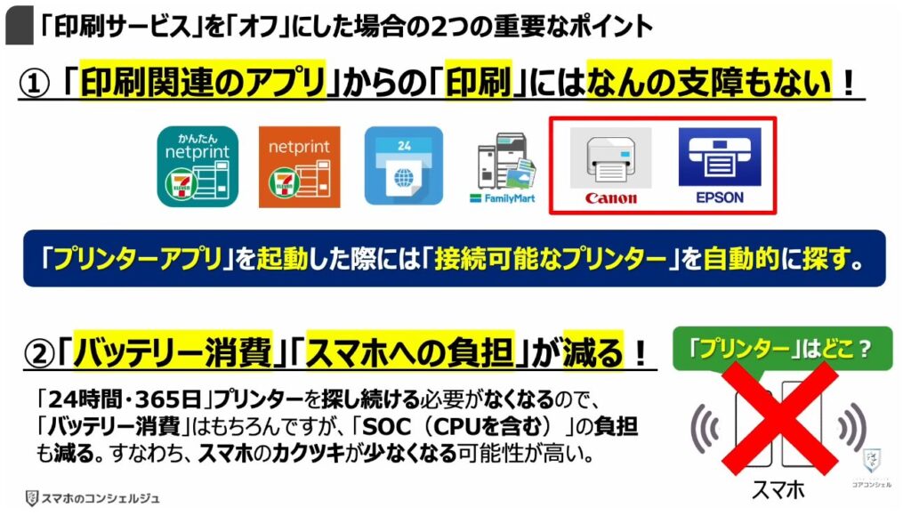 24時間365日「接続可能なプリンター」を探し続けるというアクションを止めるため、「バッテリー消費」はもちろんですが、スマホの頭脳である「SOCへの負担」も減らす事が出来、スマホのカクツキも少なくなります。