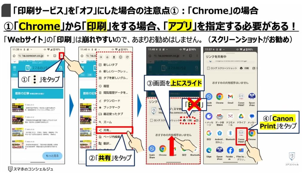 具体的には、特定のウェブサイト等を印刷する場合、「共有」をタップし、表示されている「印刷」ではなく、「Canon Print」等の「プリンターアプリ」を選択して、印刷に進む必要があります。