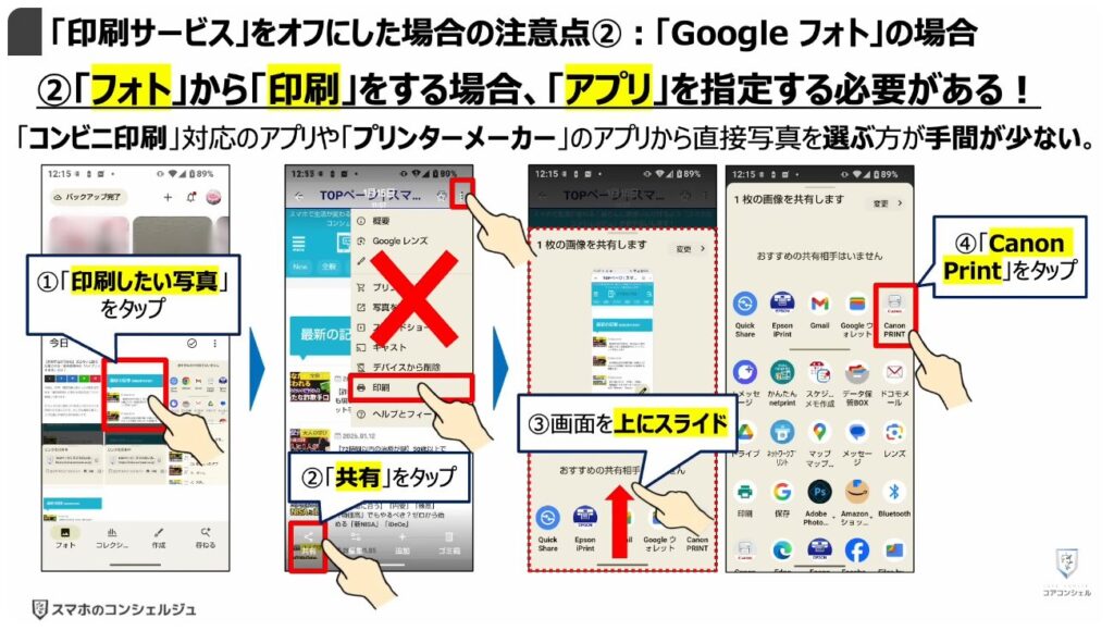 2. 「印刷サービス」を「オフ」にした場合の注意点②:「Google フォト」の場合