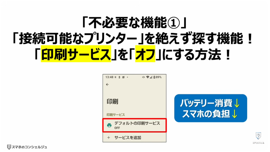 次に印刷サービスをオフにすることで「バッテリー消費」、「スマホへの負担」を減らす事が出来ます。