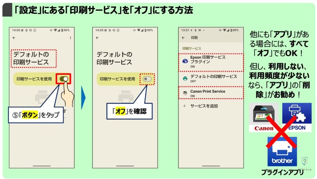 「印刷サービス」はすべて「オフ」にするか、もしくは、「印刷サービス」に「追加」されているアプリをすべて「削除」することをお勧め致します。