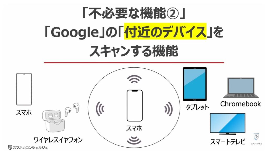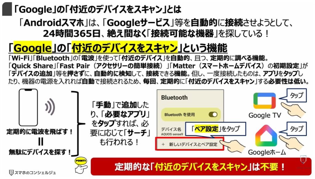 自動的に検知、接続してくれる機能は便利な場合もあるものの、一度でもスマホに接続したことがある機器は、アプリをタップしたり、電源が入ると自動的に接続されるため、この機能のようにスマホが定期的に近くのデバイスをスキャンするような必要性は全くありません。