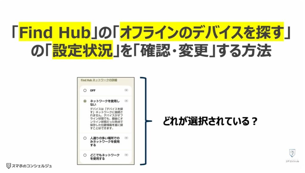 「Find Hub」の「オフラインのデバイスを探す」の「設定状況」を「確認・変更」する方法
