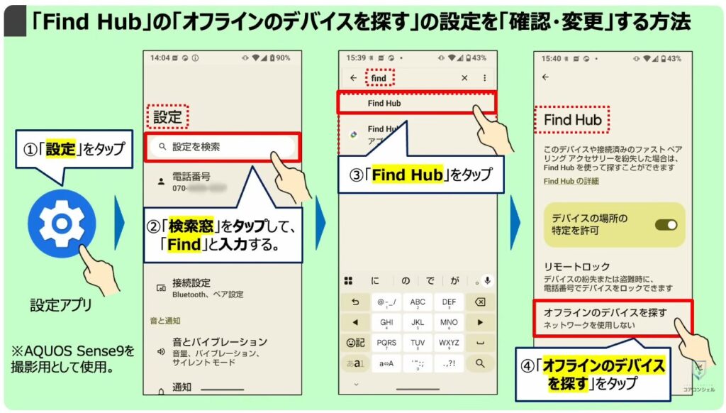 1. 「Find Hub」の「オフラインのデバイスを探す」の設定を「確認・変更」する方法
