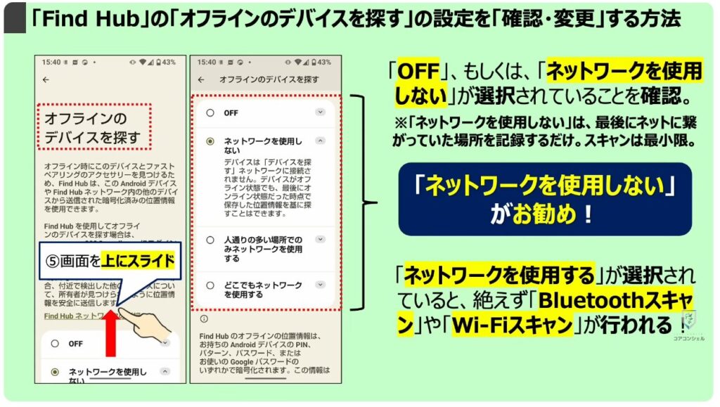 「付近のデバイスをスキャン」を止めるには、「Find Hub」の「オフラインのデバイスを探す」で「ネットワークを使用しない」、もしくは、「オフ」にする必要があります。