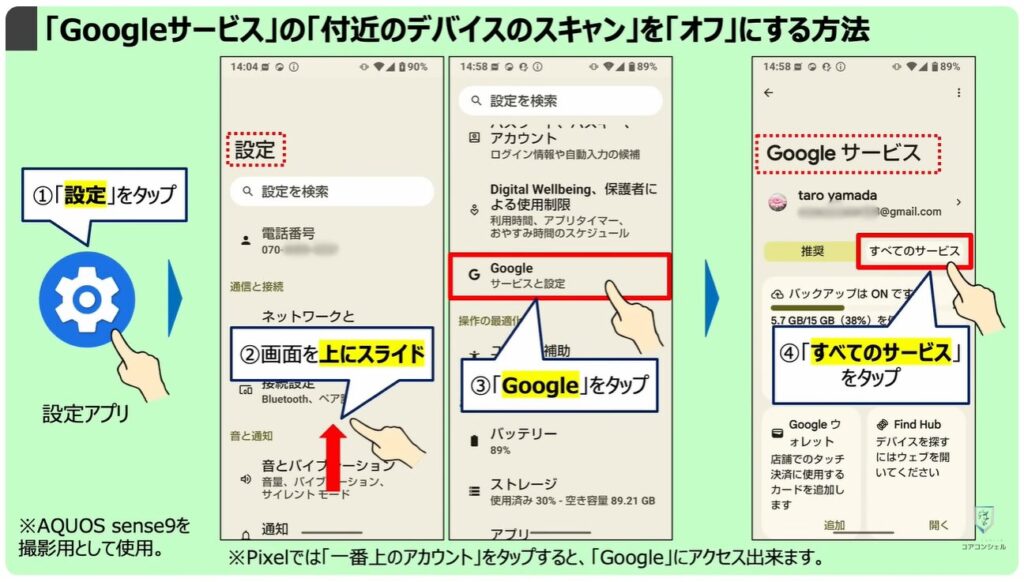 1.「Googleサービス」の「付近のデバイスのスキャン」を「オフ」にする方法