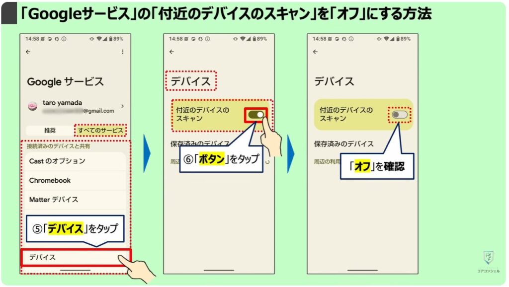「Google」の「付近のデバイスをスキャン」を「オフ」にする方法