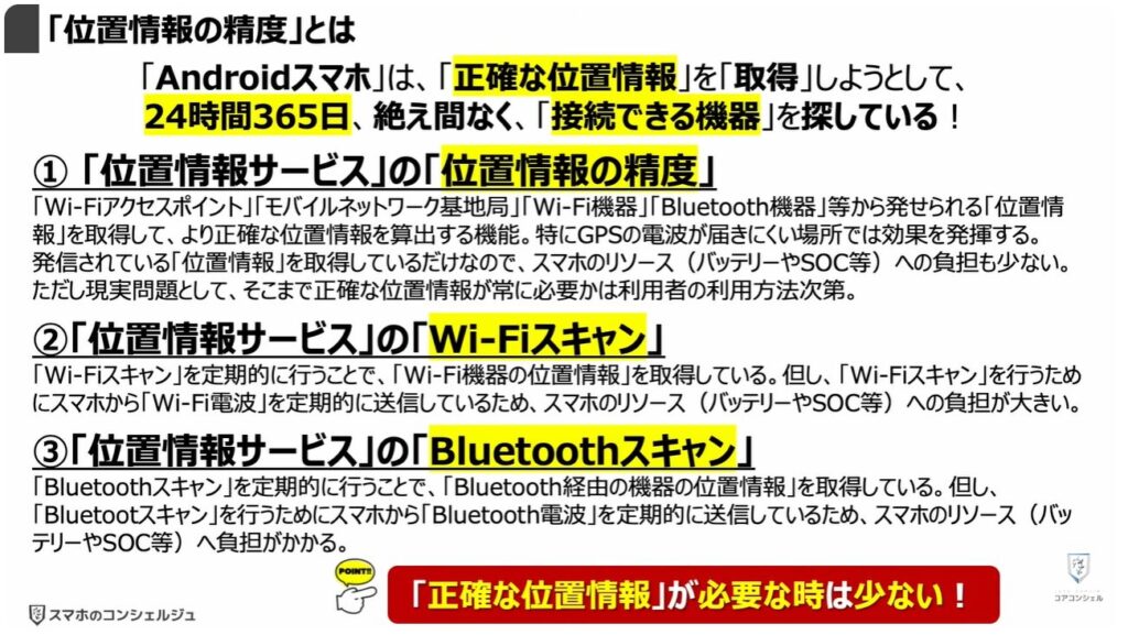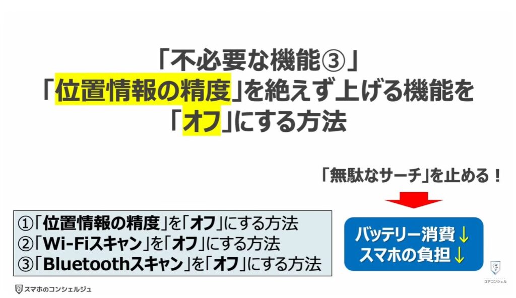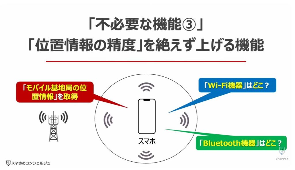 次に、不要な機能の三つ目、「位置情報の精度」を絶えず上げる機能について、詳しく確認していきましょう。