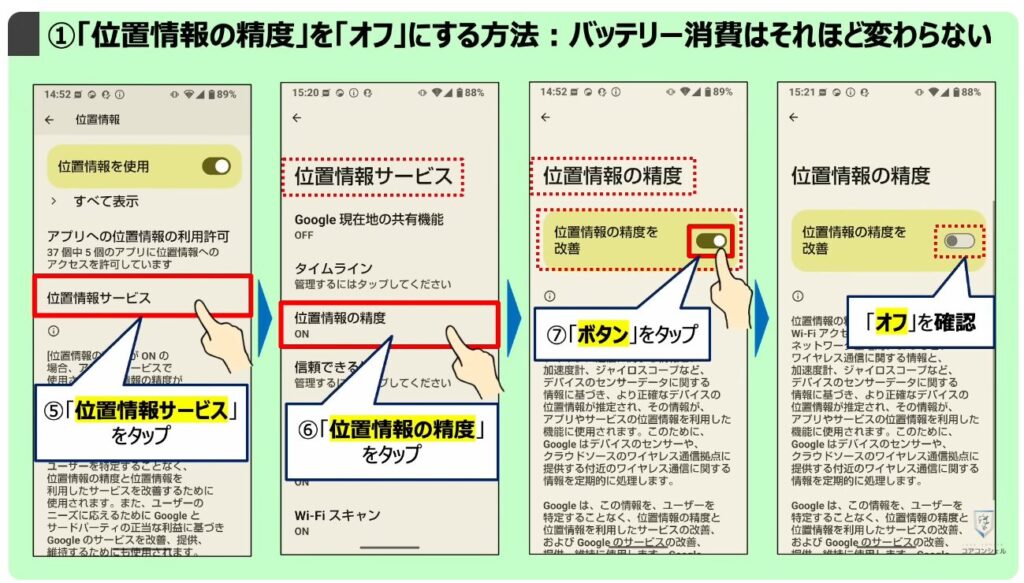 1.①「位置情報の精度」を「オフ」にする方法:バッテリー消費はそれほど変わらない!