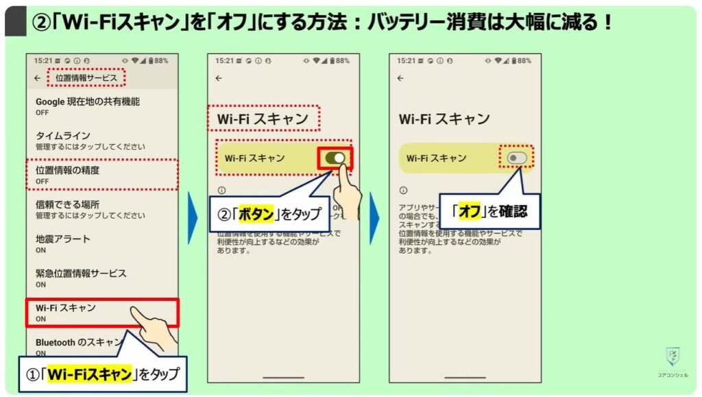 2. ②「Wi-Fiスキャン」を「オフ」にする方法:バッテリー消費は大幅に減る!