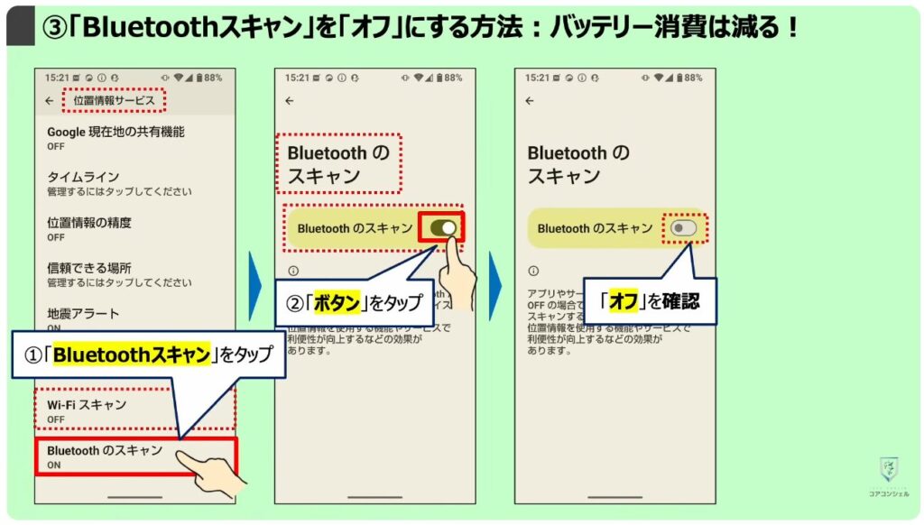 3. ③「Bluetoothスキャン」を「オフ」にする方法:バッテリー消費は減る!