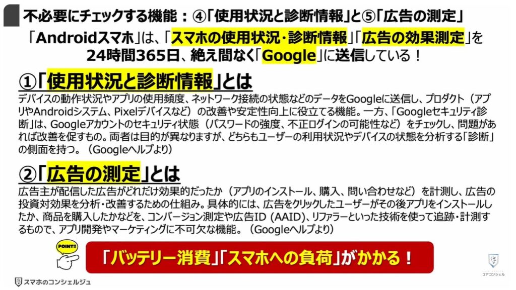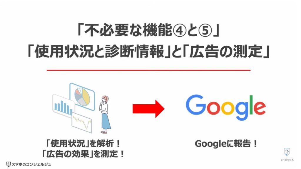 「Androidスマホ」では、「スマホの使用状況・診断情報」と「広告の効果測定」をスマホ上で行い、24時間365日絶え間なくその情報を「Google」に送信しています。