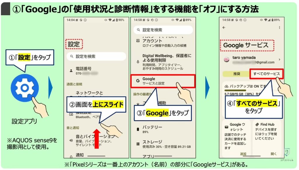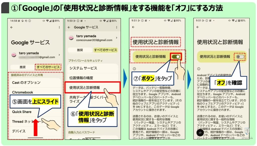 1. ①「Google」の「使用状況と診断情報」をする機能を「オフ」にする方法