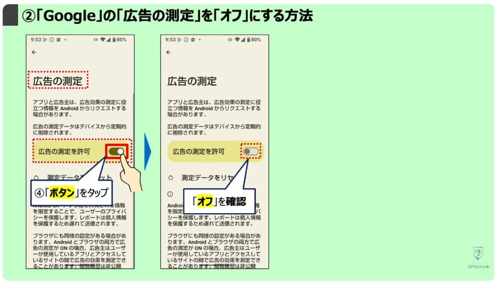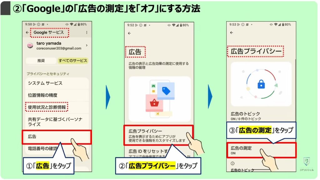 2. ②「Google」の「広告の測定」を「オフ」にする方法